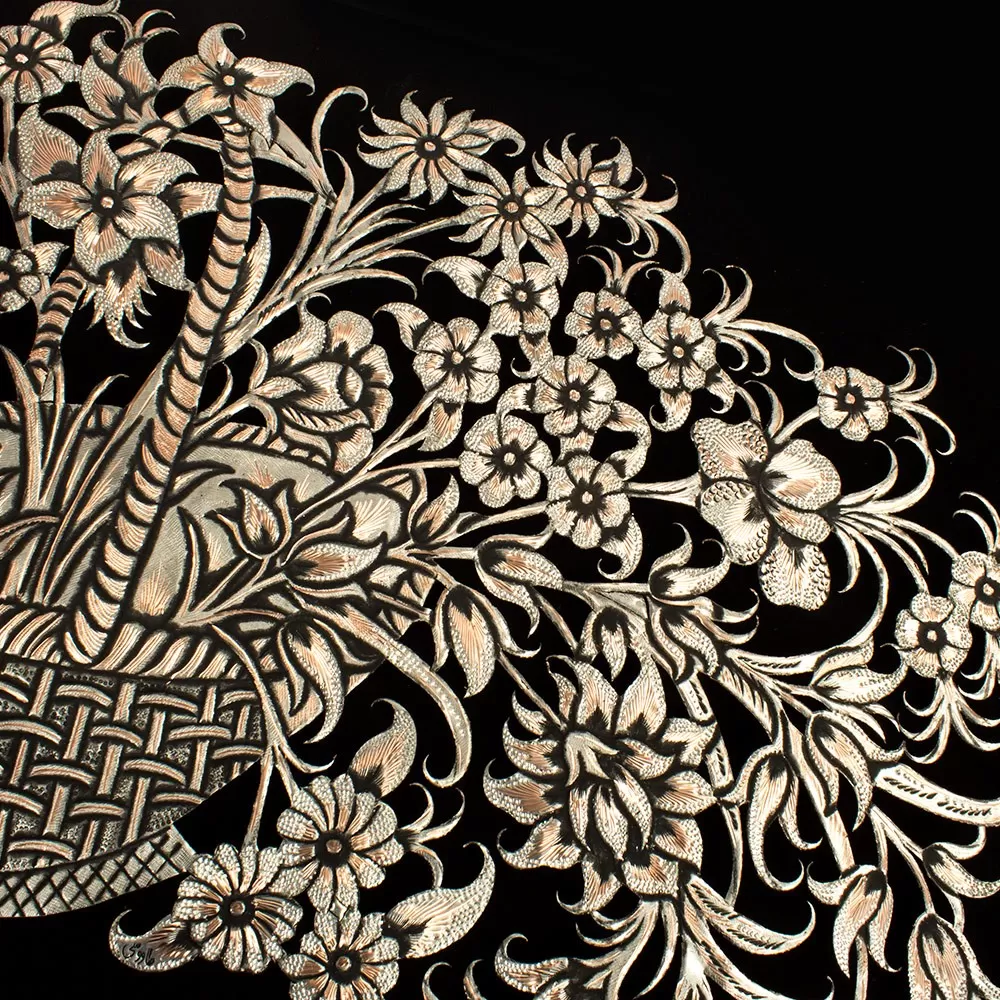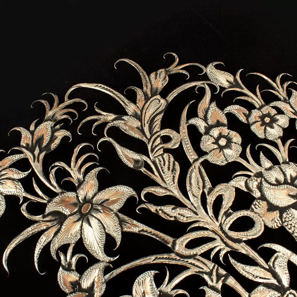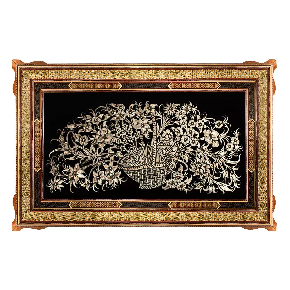 قلمزنی دستی نقش های زیبای گل و بوته این تابلوی دیواری با قاب خاتم کاری شده، آنرا به گزینه ای ایده آل و چشم نواز برای افزودن به دکوراسیون و چیدمان منزل و محل کار تبدیل کرده است.