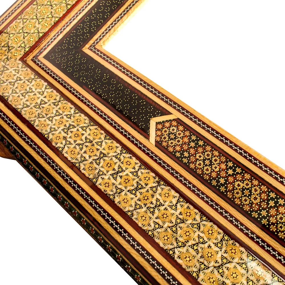 قاب چوبی خاتمکاري به ابعاد 103 × 63 سانتیمتر اين پلاک قلمزني 80×40 سانتیمتری را در بر گرفته است .