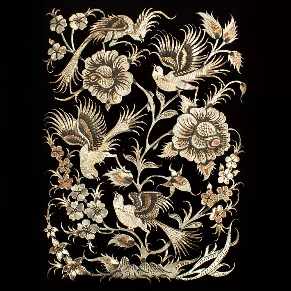 در اين تابلو،نقوشي از گل و مرغ ديده ميشوند که روي فلز مس با لعاب قلع ، قلمزني شدهاند.