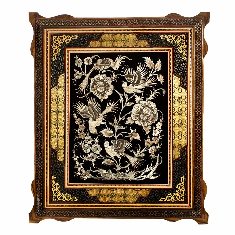 این تابلوی زیبا،گنجینهای از هنرهای ایرانی را در خود دارد. اثری با تلفیق دو هنر ارزشمند صنایعدستی ایرانی؛ خاتم کاری و قلمزنی.