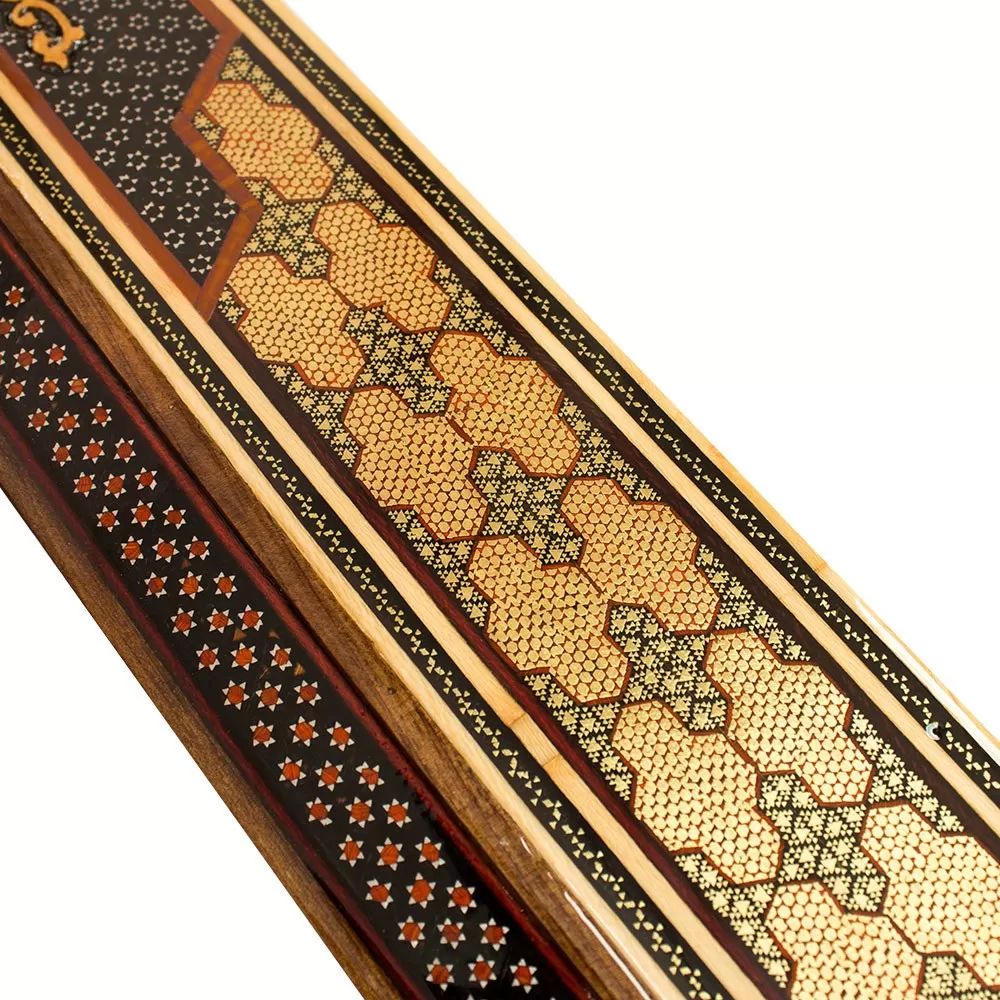 قاب چوبی خاتمکاری ممتاز گوشه دار به ابعاد 62× 52 سانتیمتر اين پلاک قلمزنی 40× 30 سانتیمتری را در بر گرفته است .