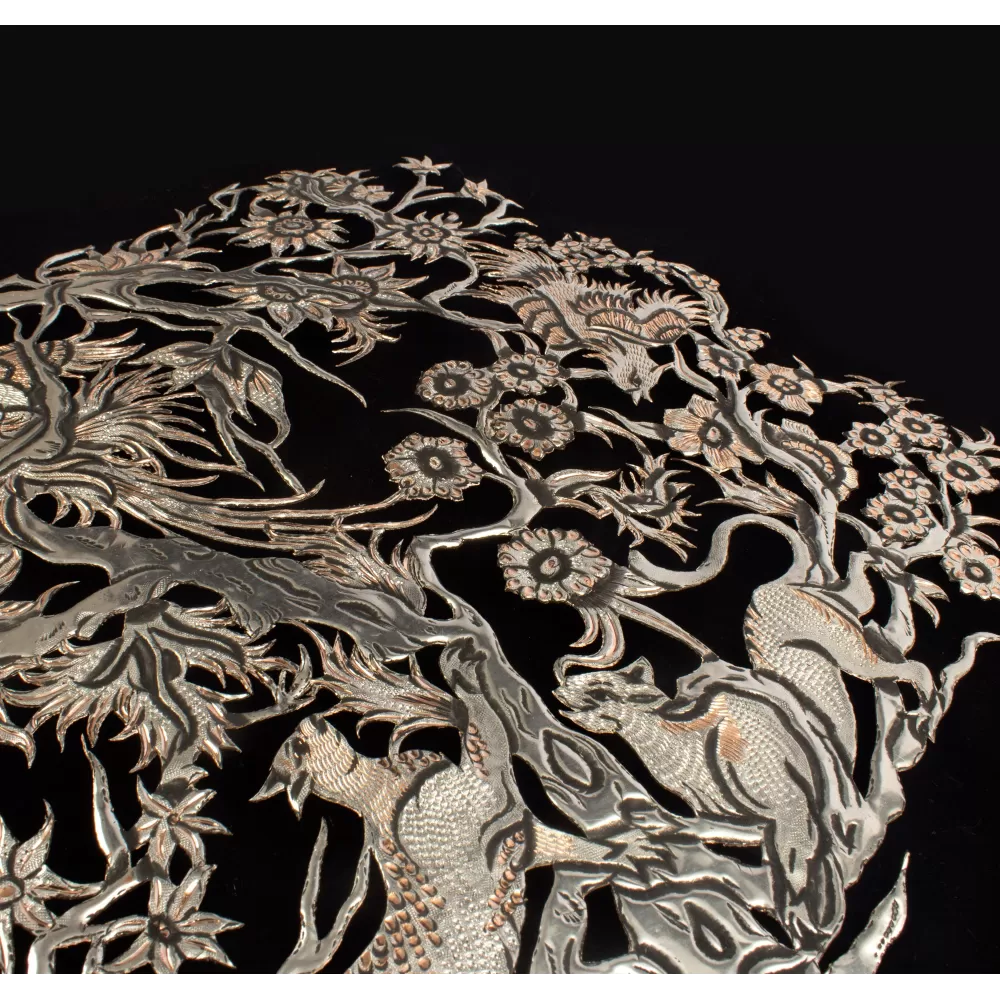 در اين تابلو ی صنایع دستی،نقوشي از گل و مرغ و حیوانات جنگل در کنار هم ديده ميشوند که روي فلز مس با لعاب قلع ، قلمزني شدهاند.