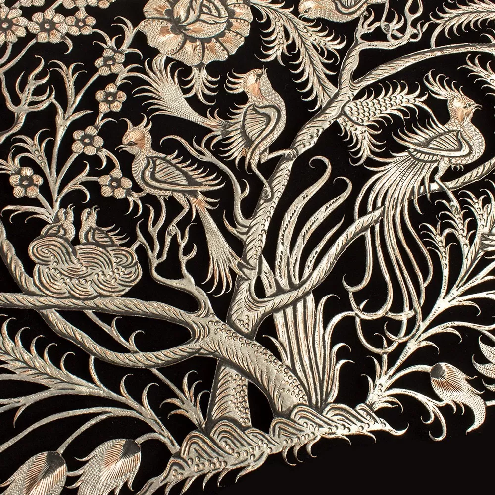 در اين تابلو ی بزرگ دیواری،نقوشي از گل و مرغ ديده مي‌شوند که روي فلز مس  با لعاب قلع ، قلم‌زني شده‌اند. قلمزنی دستی و  زیبای نقوش گل و مرغ بر روی مس، آنرا به گزینه ای ایده آل و چشم نواز برای افزودن به دکوراسیون خانه...