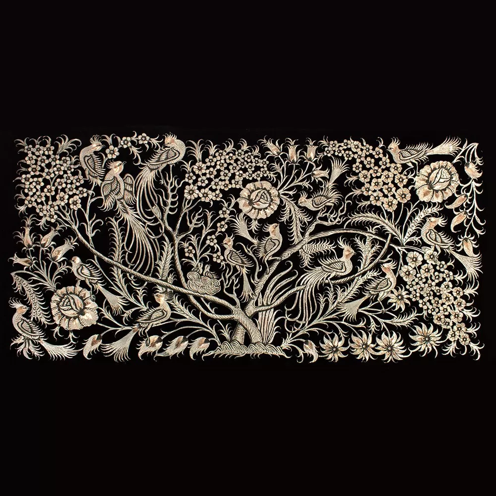 در اين تابلو ی  بزرگ صنایع دستی،نقوشي از گل و مرغ  ديده مي‌شوند که روي فلز مس  با لعاب قلع ، قلم‌زني شده‌اند.