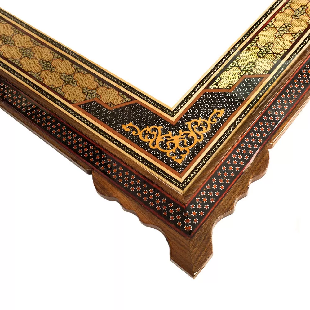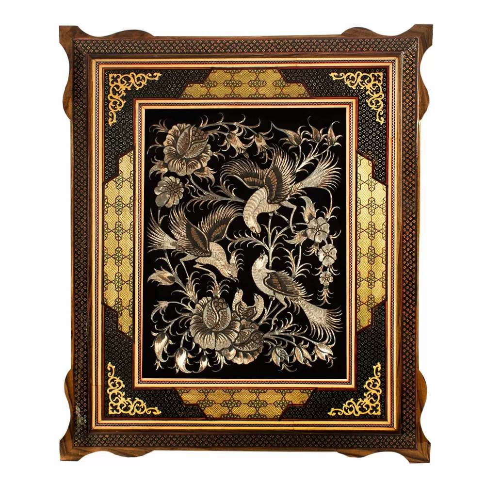 فضاي اطراف طرح ،پارچهاي از جنس جير و به رنگ مشكي قرار داده شده كه اين اثر نقرهاي رنگ جلوهي بيشتري داشته باشد. قاب چوبی خاتم کاری، اين اثر ظريف و زيبا را در بر گرفته است.