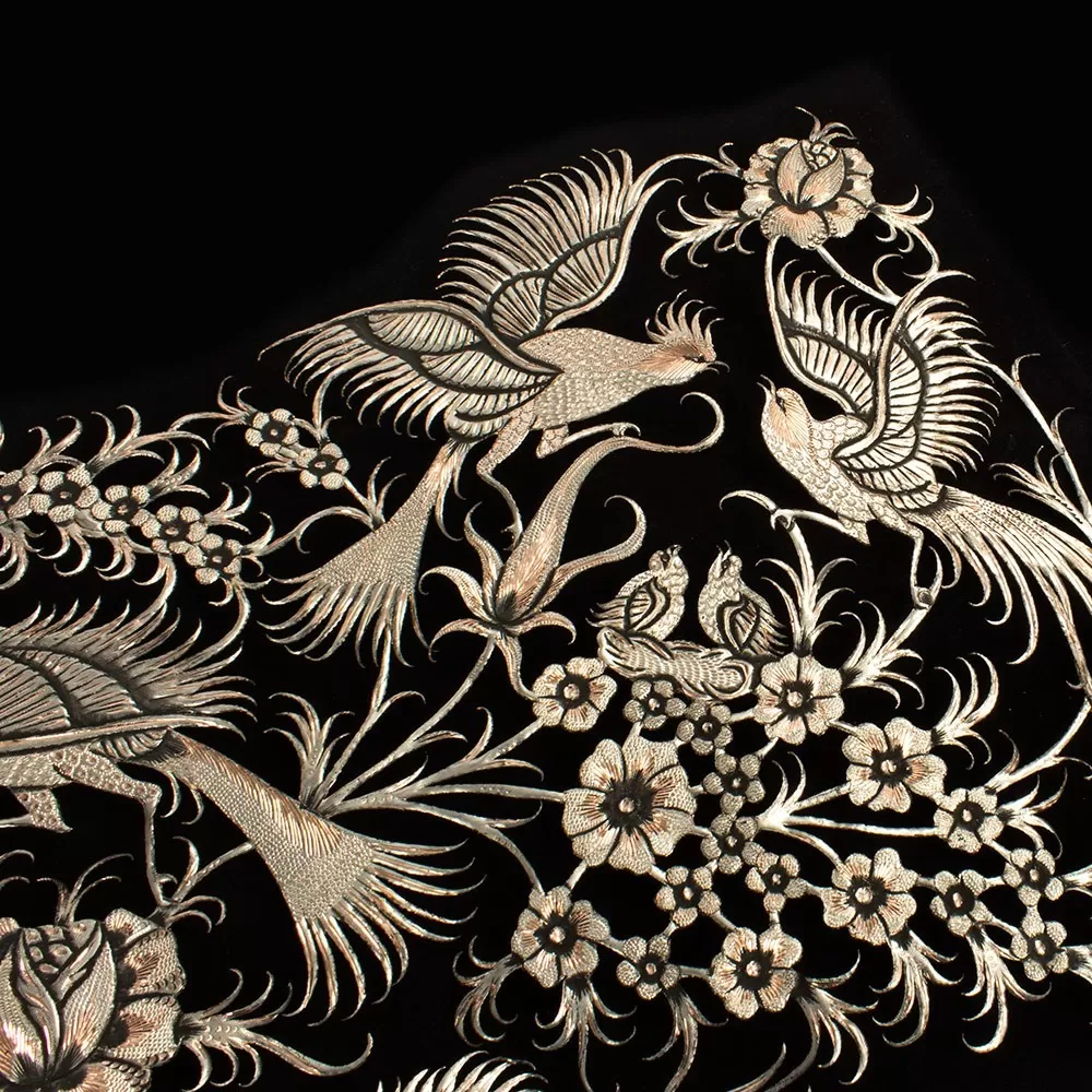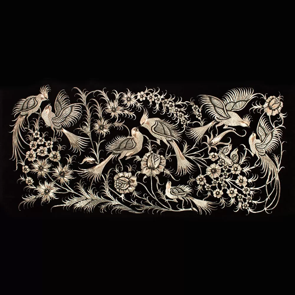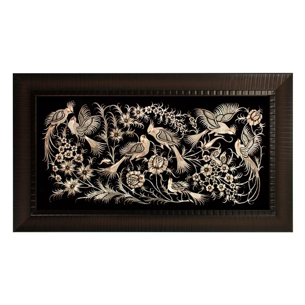 در اين تابلو ی بزرگ صنایع دستی نفیس،نقوشي از گل و مرغ ديده ميشوند که روي فلز مس با لعاب قلع ، قلمزني شدهاند.