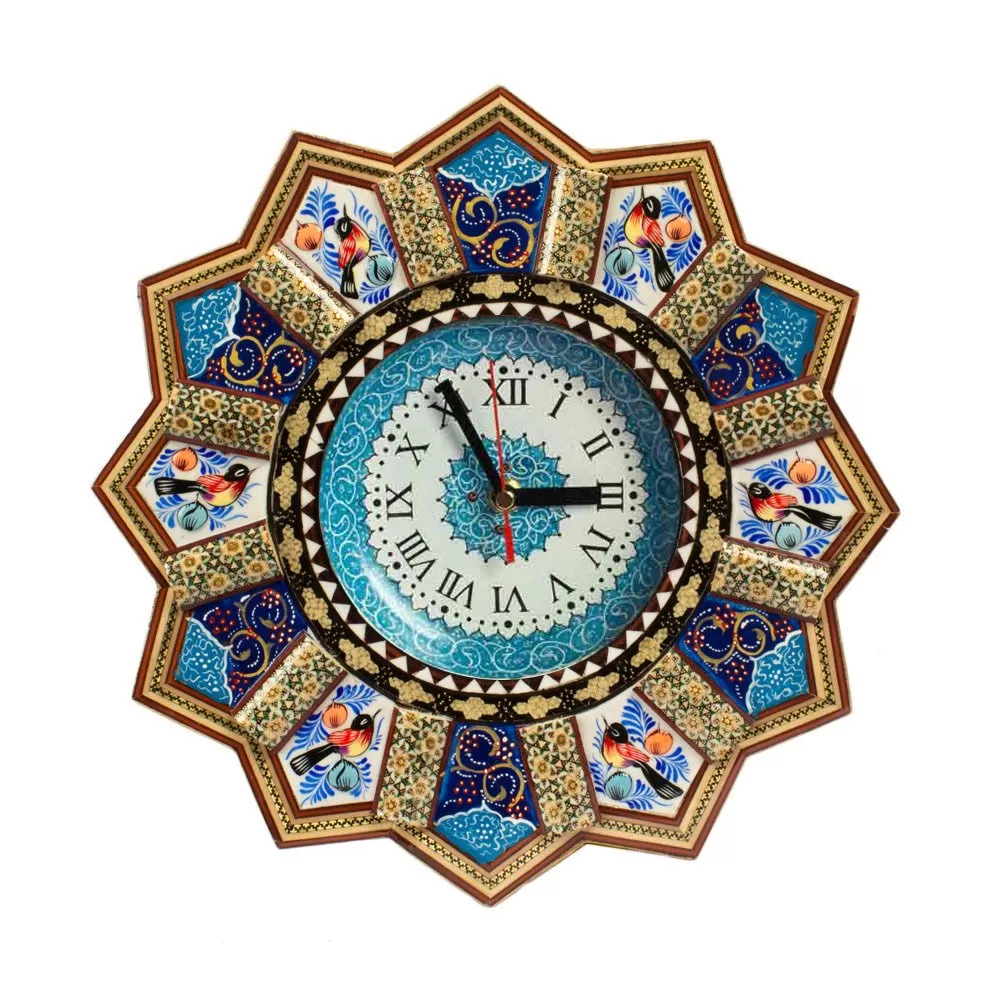 این ساعت تبلیغاتی شیک ترکیبی از سه هنر خاتم کاری، میناکاری، نقاشی مینیاتور با طراحی و قلم ظریف و زیبا می باشد.