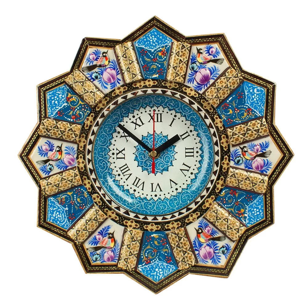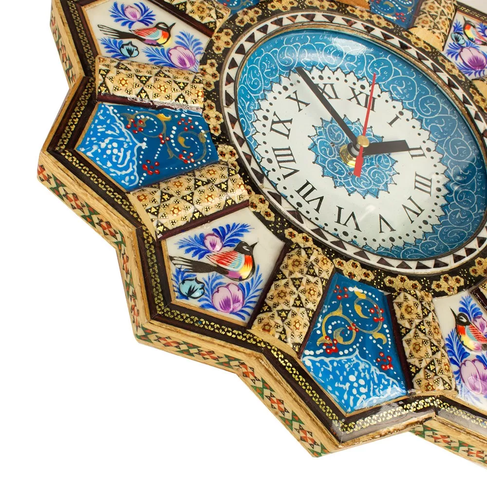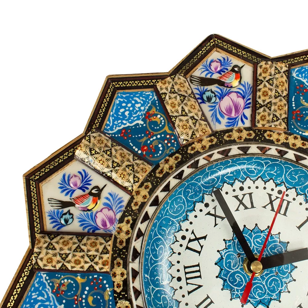 ساعت دیواری با صفحه مسی نقاشی میناکاری و قاب چوبی خاتم کاری نقاشی گل و مرغ به ابعاد 32 سانتیمتر.