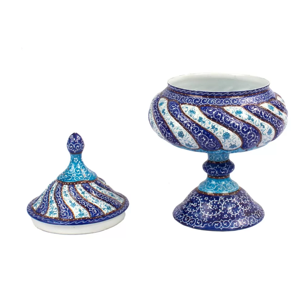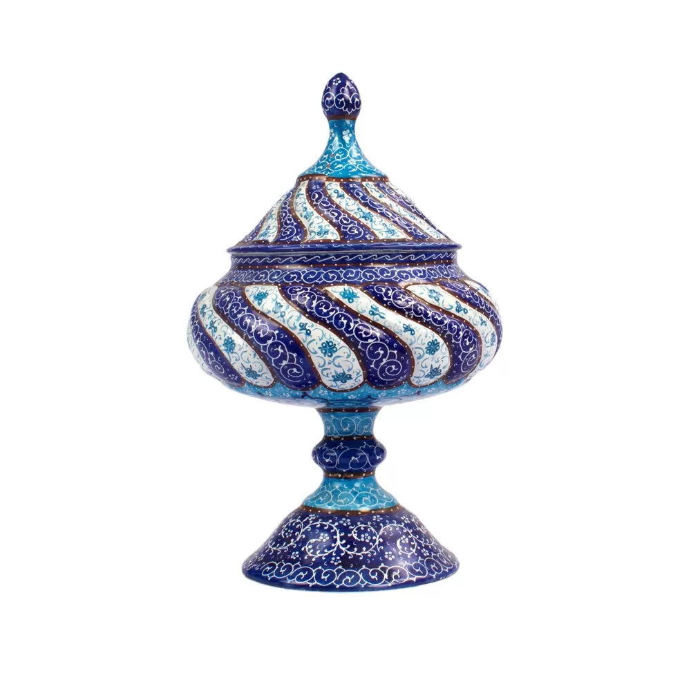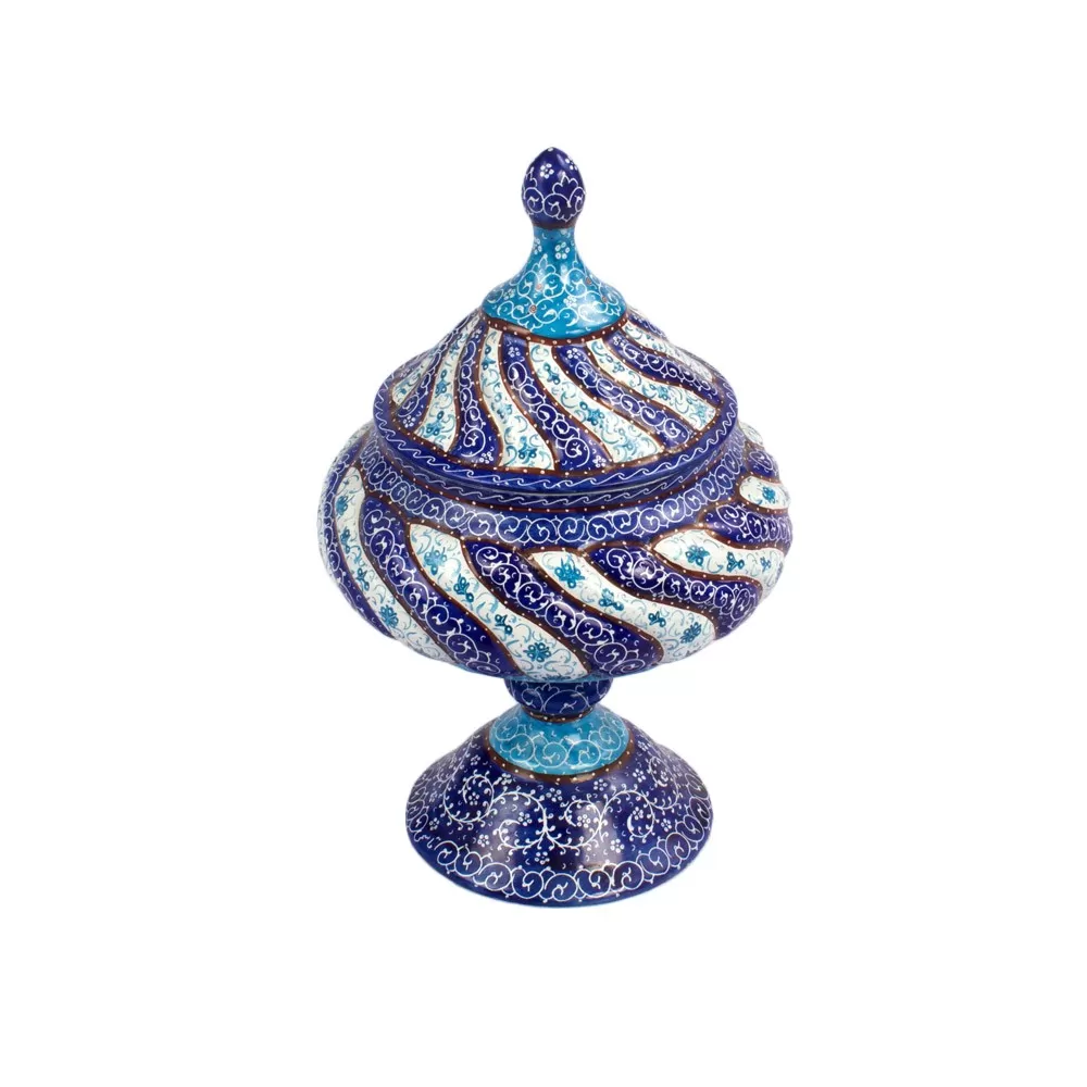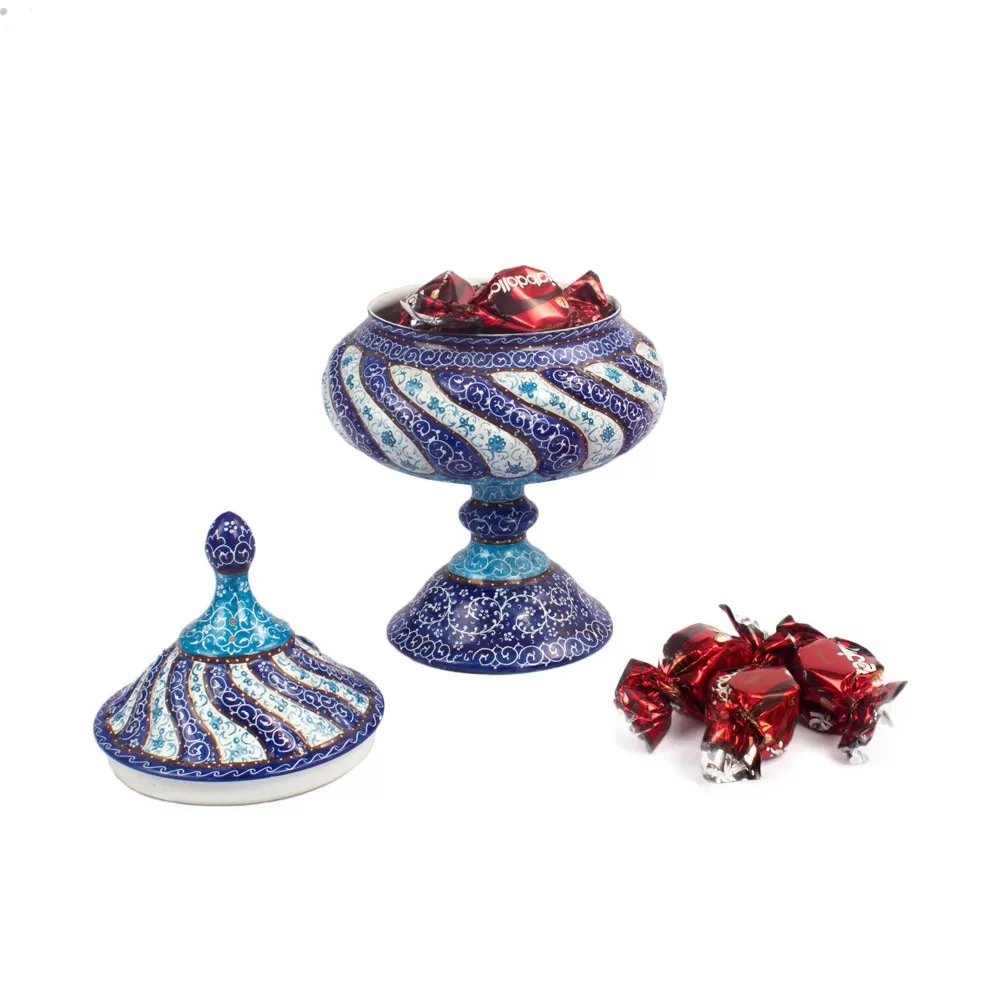 این قندان زیبای درب دار به دست هنرمندان ایرانی تولید شده است.سطح خارجی این قندان توپی پایه دار شکل سرشار از طرح و نقش های زیبا است. تناسب و رعایت تعادل در استفاده از رنگهای تیره و روشن و درب دار بودن ظرف یک اثر متفاوت و نفیس پدید آوره است.