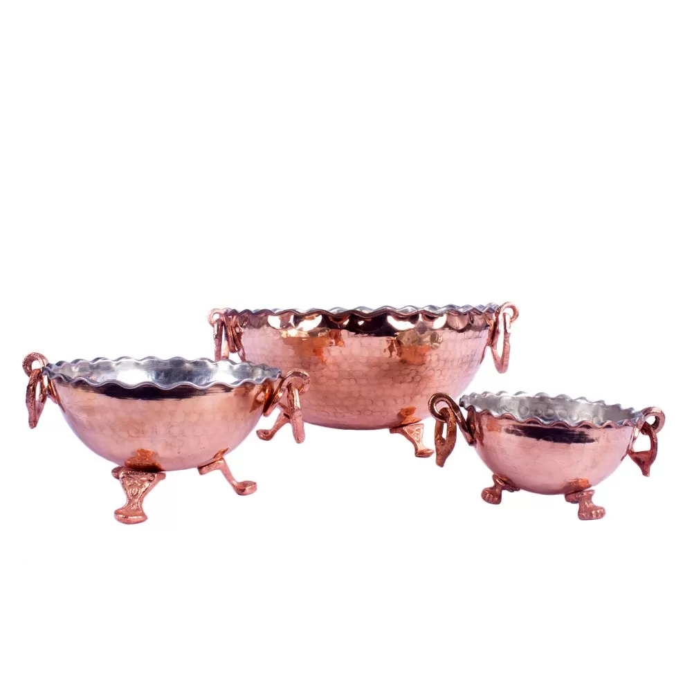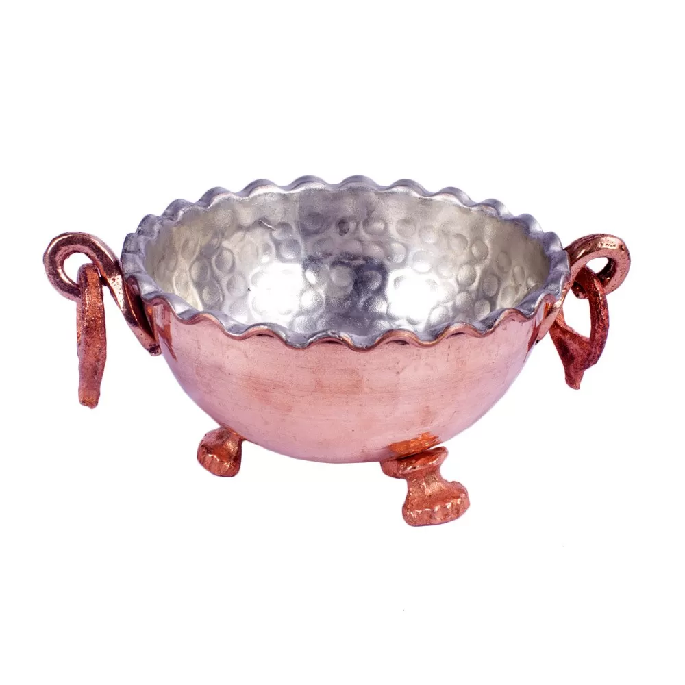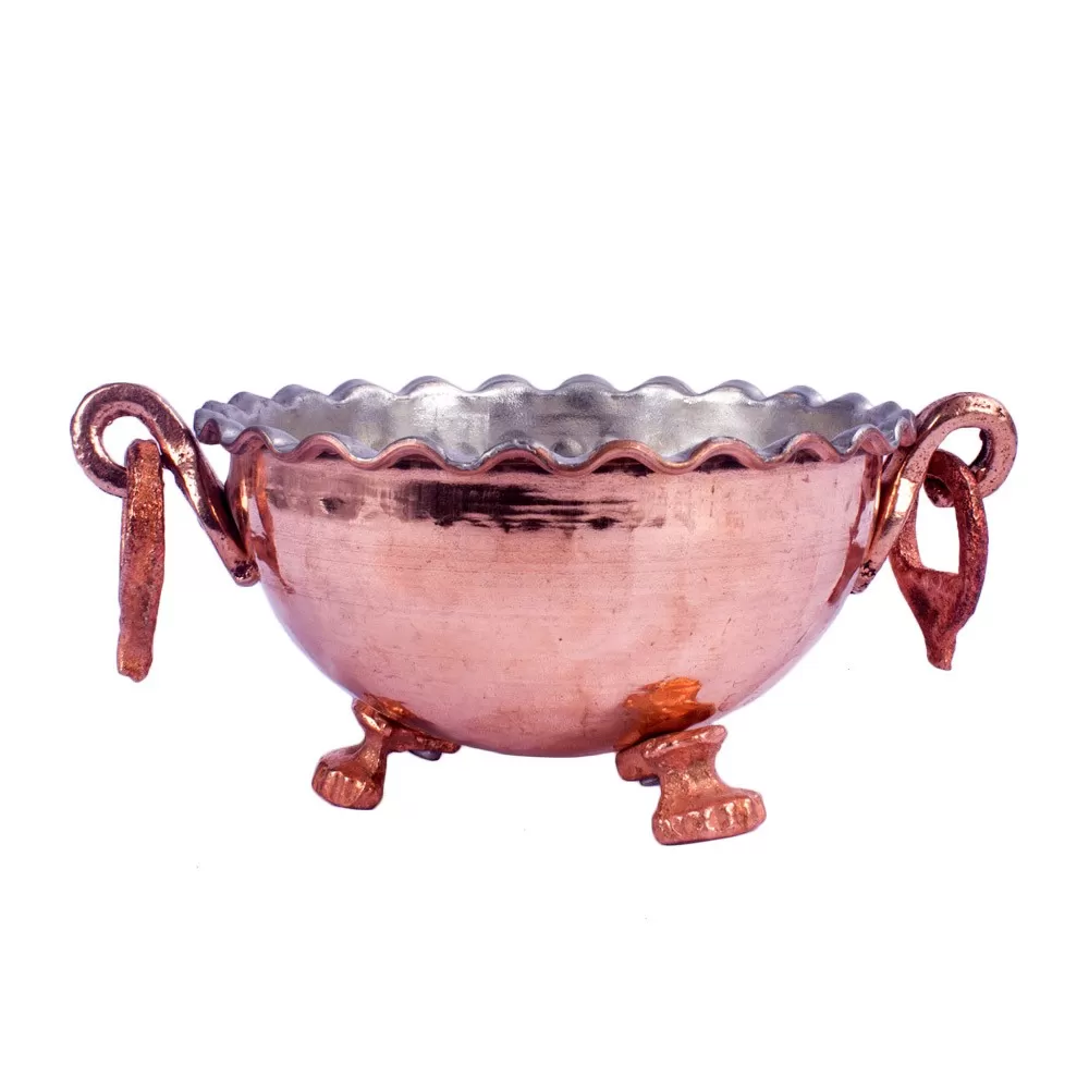 سطح بدنه چکش کاری شده و سطح داخلی نیز قلع کاری شده است پایه ها و دستگیره های گوشواره ای نمای زیبایی به آجیل خوری بخشیده است.