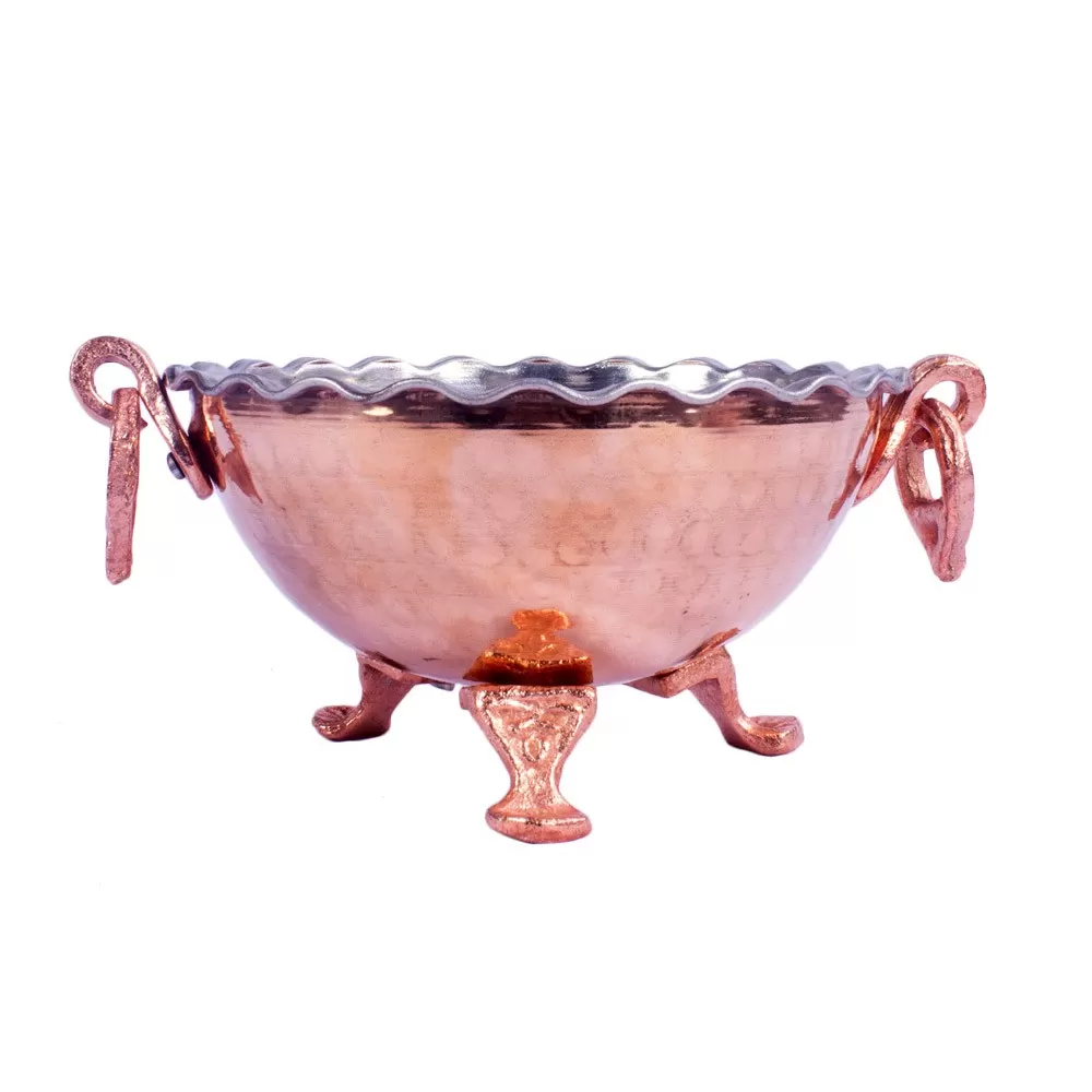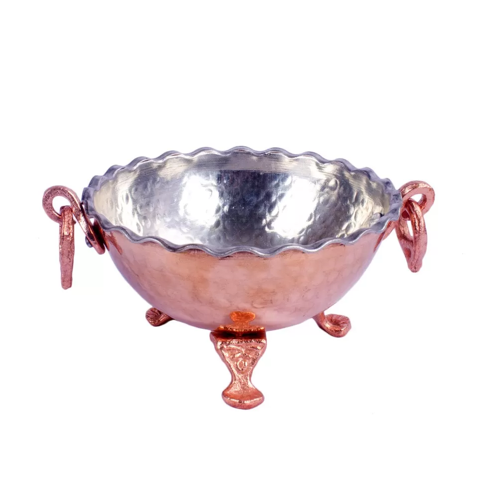سطح بدنه چکش کاری شده و سطح داخلی نیز قلع کاری شده است پایه ها و دستگیره های گوشواره ای نمای زیبایی به آجیل خوری بخشیده است.