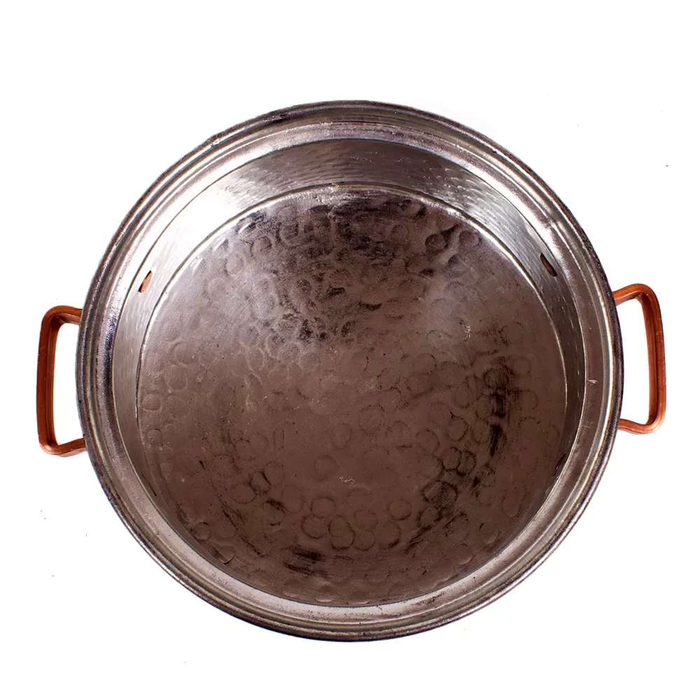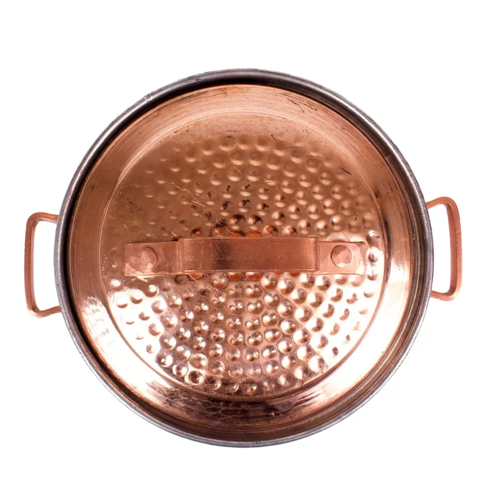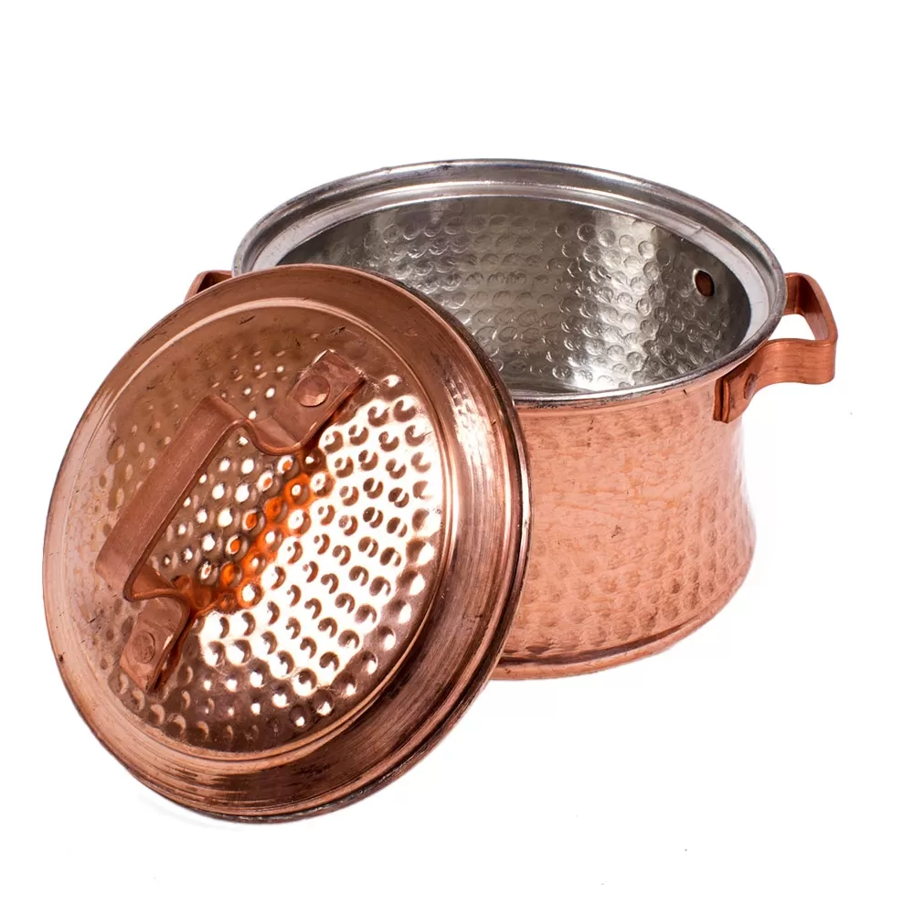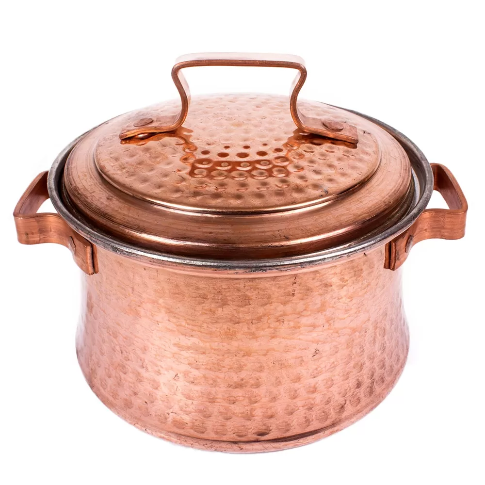 سطح بدنه این قابلمه مسی چکش کاری  و سطح داخلی قلع کاری شده است.درب مسی دسته دار از خارج شدن بخار و گرمای داخل ظرف به بیرون  جلوگیری می کند.