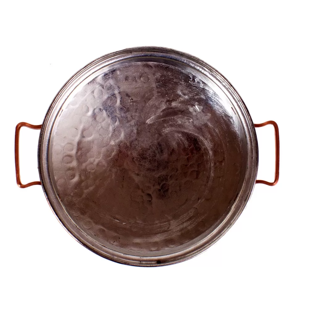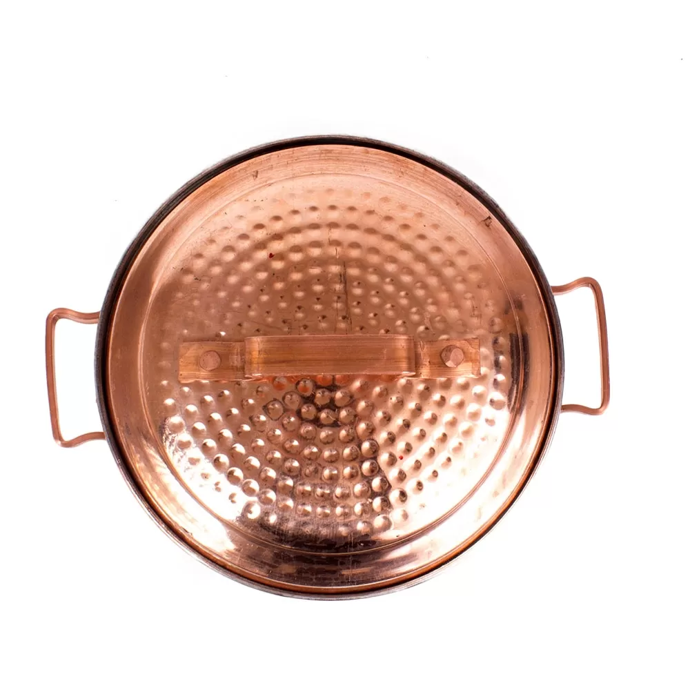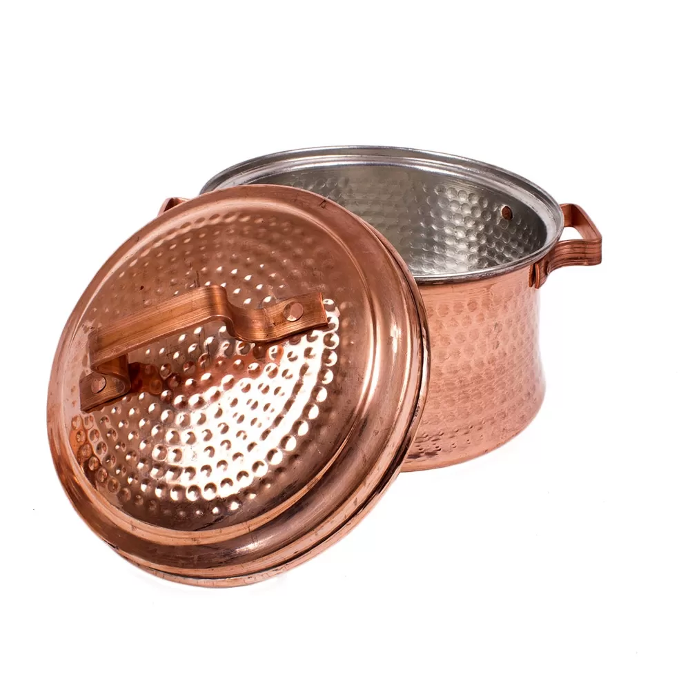 سطح بدنه این ظرف مسی چکش کاری و سطح داخلی قلع کاری شده است.درب دسته دار مسی از خارج شدن بخار و گرمای داخل ظرف به بیرون جلوگیری می کند.