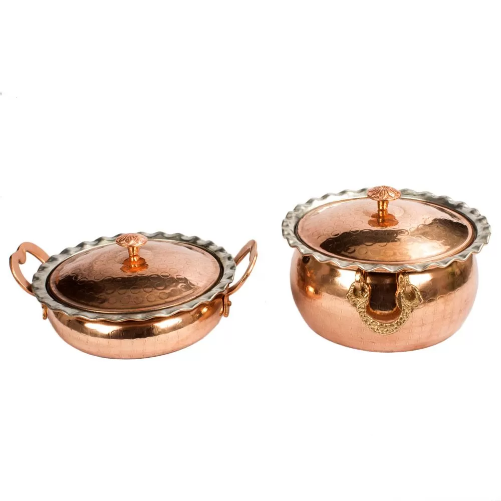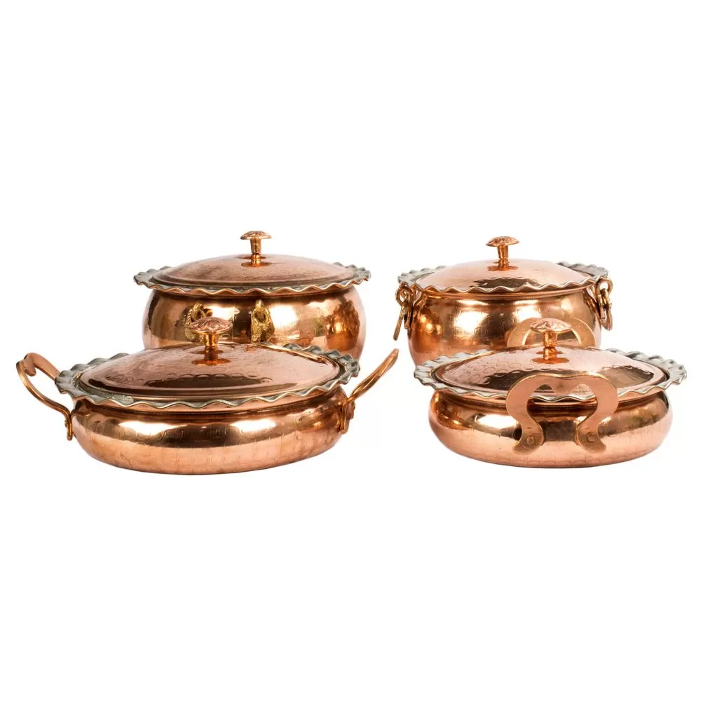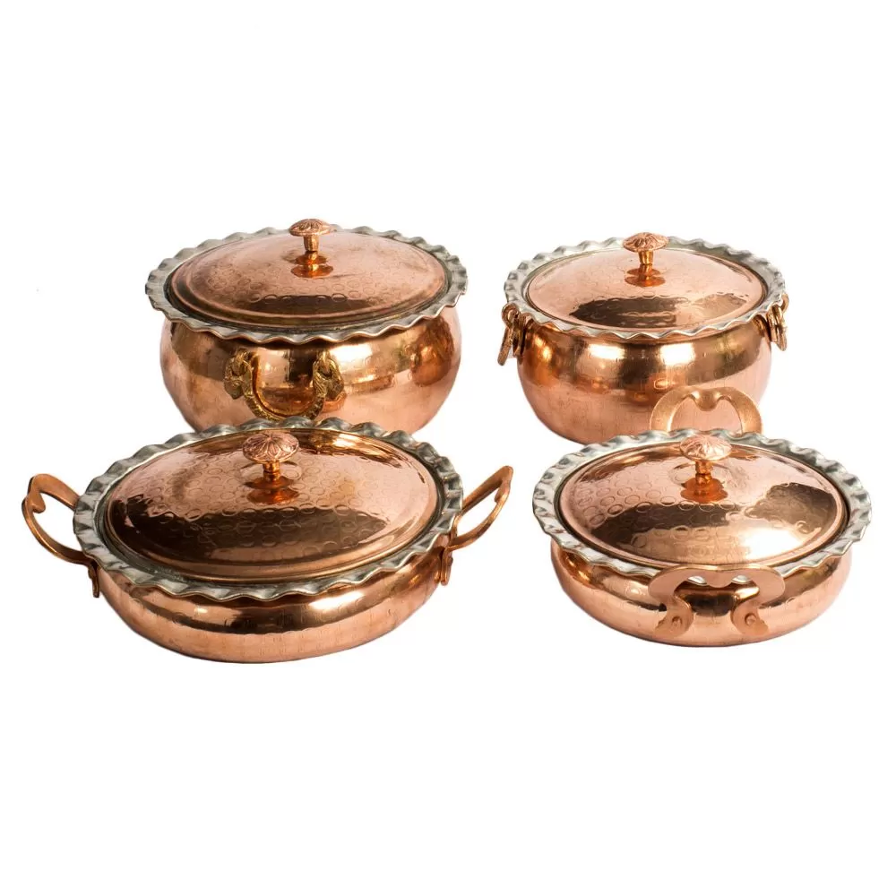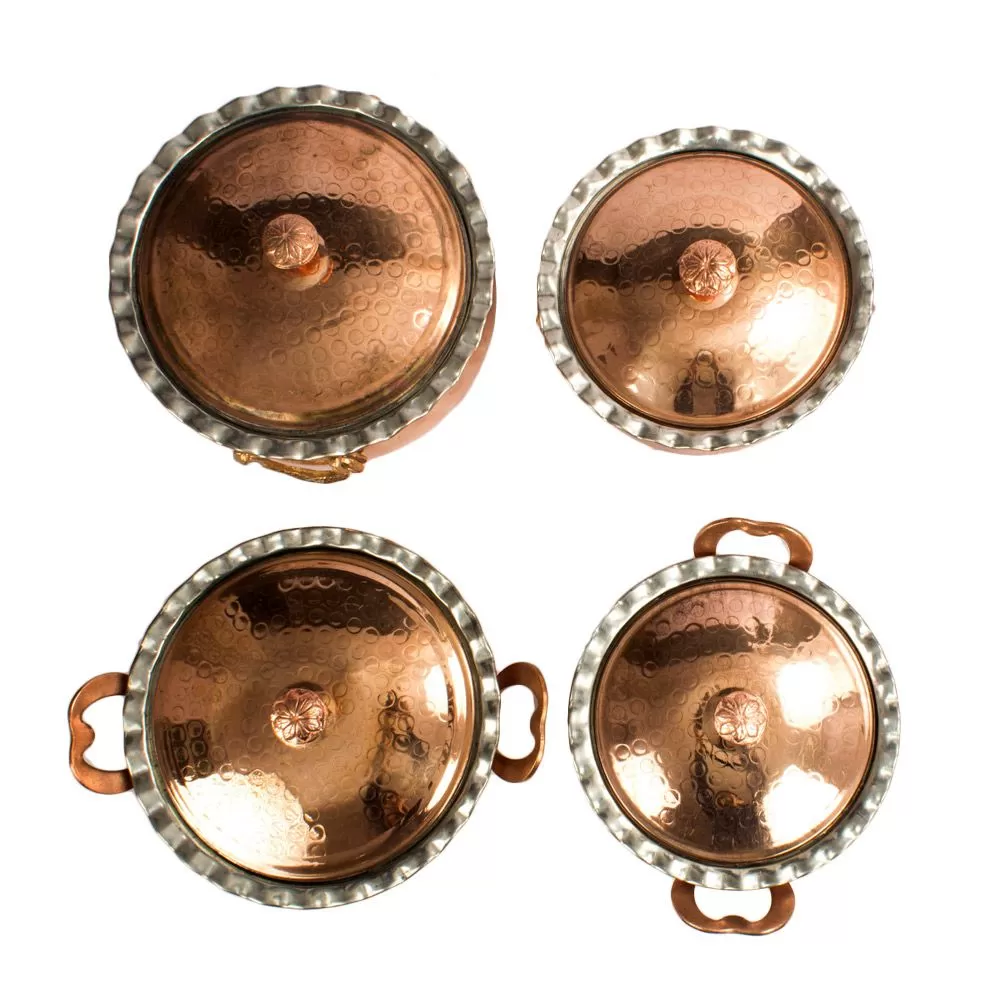 این ست 8 پارچه شامل دو قابلمه  و دو ماهیتابه خمره ای لب کنگره دار مسی درب دار در دو سایز  به قطر دهانه  23 و 20 سانتیمتر و وزن مجموع 5700 گرم برای پخت و پز در آشپزخانه ، جهیزیه عروس،رستوران سنتی و.... میباشد.